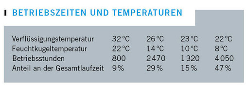 Eine Betrachtung der Häufigkeit von Außentemperaturen führte zu dem Ergebnis, dass für 47 % der Laufzeit (4050 Stunden) eine Verflüssigungstemperatur von 22 °C ausreichend ist. Die Betriebsstunden für die verschiedenen Temperaturen sind tabellarisch dargestellt. Bei der Berechnung wurde zugrunde gelegt, dass die Froster das ganze Jahr über mit 100 % Leistung laufen.