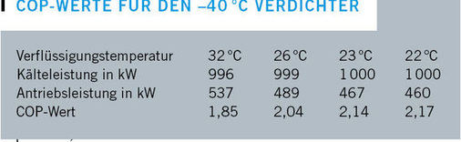 Da das Konzept die separate Abtaustufe beeinhaltet, kann die Gesamtanlage mit der niedrigstmöglichen Verflüssigungstemperatur betrieben werden. Theoretisch seien noch niedrigere Verflüssigungstemperaturen als 22 °C möglich, entsprechende Optimierungsarbeiten sollen aber erst dann verfolgt werden, wenn Betriebserfahrungen vorliegen: Hierfür seien jedoch noch Umbauten an den Schraubenverdichtern (geändertes Ölmanagement, veränderte Steuerung und Leistungsregelung) erforderlich. Die Kälteanlage soll denn mit gleitenden Verflüssigungstemperaturen von 15 bis 32 °C zu betreiben sein, was den Stromverbrauch weiter minimiere.