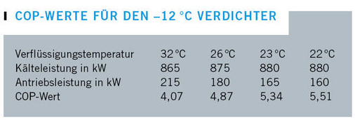 Den Einfluss auf den COP durch die verschiedenen Verflüssigertemperaturen ist für den 40 °C Verdichter GEA Grasso Typ XCE-6B und den 12 °C Verdichter GEA Grasso Typ SB-6A ebenfalls tabellarisch dargestellt.