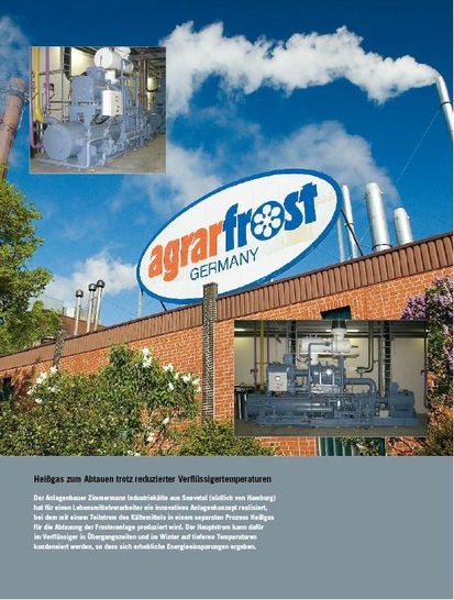 Derzeit stehen zwei Aktivitäten bei Agrarfrost im Mittelpunkt: Im Jahr 2008 wurde mit dem Aufbau einer neuen Spezialitätenabteilung begonnen und ebenso aktuell ist die Agenda Nachhaltigkeit. Zu dieser gehört die Errichtung einer hochmodernen Kältezentrale, die in Teilen seit Oktober 2008 läuft. Im Endausbau liefert diese für die Froster und die Tiefkühlung 7 MW Kälteleistung bei einer Verdampfungstemperatur von 40 °C und 3,5 MW auf einem Temperaturlevel von 12 °C für andere Anwendungen. Als Kältemittel sollte aus wirtschaftlichen und ökologischen Gründen das natürliche Kältemittel Ammoniak eingesetzt werden.