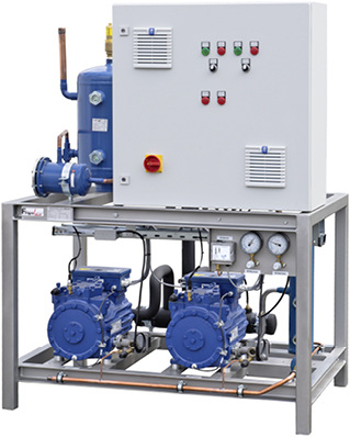 Im Bereich der Standard-Verbundsysteme gibt es nun DUO-Verdichtersätze, die für den Einsatz mit Frequenzumrichtern vorgesehen sind. Ein Verdichter ist generell immer frequenzgeregelt in Betrieb und nimmt die Funktion des Leitverdichters ein. Der zweite Verdichter wird bei Bedarf vom Frequenzumrichter geregelt zugeschaltet. Mittels einer Sequenzumschaltung über den Frequenzumrichter wird eine gleichmäßige Auslastung beider Verdichter erreicht. Aktuell stehen sieben Baugrößen für den Einsatz mit R 134 a zur Wahl. Zudem gibt es bei Frigotechnik eine umfangreiche Produktpalette an Komponenten speziell für den Einsatz mit natürlichen Kältemitteln.