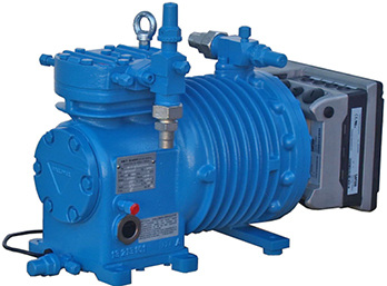 Die Verdichter HS/HT 12 (Bild) bis HS/HT 34 sind nun mit noch effizienteren aufgeflanschten Frequenzumrichtern Motec 8400 (Schutzart IP65) ausgestattet. Die Konfiguration ist fertig parametriert, kleiner, leichter und erreicht ein höheres Startmoment (200 Prozent Überstrom für 60 s). Die Umrichter haben ein Speichermodul, das beim Wechsel des Umrichters umgesteckt wird, so dass dieser ohne Neuparametrierung sofort wieder betriebsbereit ist. Goeldner-Verdichter mit kugelgelagerter Exzenterwelle und Pipettenschmiersystem arbeiten zusammen mit öllöslichen Kohlenwasserstoff-Kältemitteln zuverlässig in einem Drehzahlbereich von 600 bis 2 200 U/min. Alle offenen Verdichter sind für NH3 und das Gemisch NH3/Dimethylether (R 723) einsetzbar. Halle 4A, Stand 321