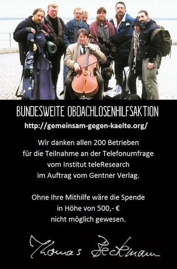 Gemeinsam gegen Kälte e.V. hilft obdachlosen Menschen z.B. durch Medizinische Ambulanzbusse oder durch die Einrichtung von Wärmestuben und Wohngemeinschaften. Gegründet wurde diese Initiative von dem Cellisten Thomas Beckmann.