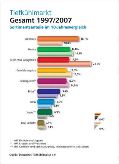 Laut Deutschem Tiefkühlinstitut (dti) wuchs der Gesamtverbrauch von Tiefkühlkost (ohne Speiseeis) im Lebensmittelhandel sowie im Außer-Haus-Markt in den vergangenen zehn Jahren um knapp 60 Prozent auf 3,136 Millionen Tonnen in 2007. Der Pro-Kopf-Verbrauch stieg in diesem Zeitraum von 26,6 auf 38,1 Kilogramm und kletterte somit erstmals über die 38-Kilogramm-Marke. Der Gesamtumsatz lag bei 10,5 Milliarden Euro mit einer Steigerungsrate von 4,5 Prozent im Vergleich zum Vorjahr. Aufgrund der anhaltenden positiven Marktentwicklung und den Rekorden bei Absatz und Umsatz mit Tiefkühlkost blickt die Tiefkühlwirtschaft optimistisch in die Zukunft.