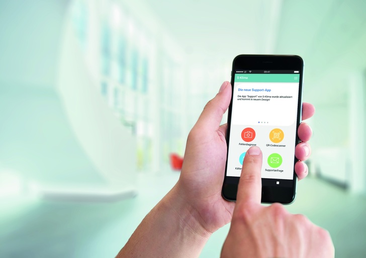 Die überarbeitete Version der Support-App erscheint im komplett neuen Design von S-Klima und mit benutzerfreundlicher Oberfläche. Die Fehlercodeanalyse, die auch offline verfügbar ist, erfolgt mit einem übersichtlichen Menü und erspart das Arbeiten mit Handbüchern. In wenigen Schritten führt das Menü von der Auswahl der verbauten Geräteserie über den per Fernbedienung oder Geräteplatine angezeigten Fehlercode direkt zur Ursachenbeschreibung und passenden Lösungsvorschlägen. Reichen diese nicht aus, lässt sich per E-Mail aus der App ein Rückruf des technischen Supports anfordern. Neben dem Fehlercode können dabei Fotos und ein beschreibender Text übermittelt werden. Die Seriennummer des jeweiligen Geräts wird per QR-Code-Scanner erfasst.