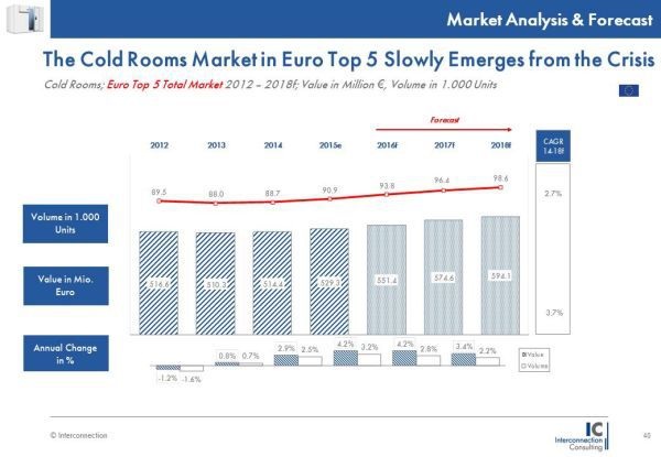 Wie bereits erwähnt, ist die positive Entwicklung des Marktes laut Interconnection Consulting stark von der Erholung des Einzelhandelsmarktes in fast allen untersuchten Ländern positiv beeinflusst. Der Markt für Kühlzellen wird im Prognosezeitraum auch weiterhin mit einem jährlichen Durchschnittswachstum von 2,7 Prozent in der Menge steigen und 98.600 verkaufte Einheiten im Jahr 2018 erreichen. Der Umsatz wird sich ebenfalls mit einem jährlichen Plus von 3,7 Prozent auf 594,1 Mio. Euro im Jahr 2018 positiv entwickeln. (RM)