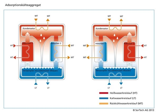 Die entscheidende Innovation: Während die wirtschaftlichen Einsatzmöglichkeiten von Absorptionsverfahren bislang in der Regel beschränkt waren auf hohe Antriebstemperaturen von über 90°C und Kälteleistungen von über 50 kW, hat das Unternehmen SorTech AG erstmals Aggregate entwickelt, die zur Kälteerzeugung das Adsorptions- statt dem Absorptionsverfahren einsetzen. Wie die durch die BAFA bis zu 50 Prozent bezuschusste solare Kühlung funktioniert und erfolgreich in einem Wohnprojekt in Sachsen-Anhalt eingesetzt wird, lesen Sie in nächsten KK.