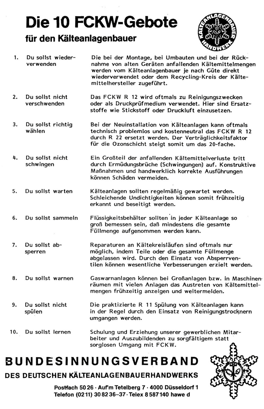 Zwischenzeitlich wurde mit Hochdruck nach Alternativen zu den FCKW-Kältemitteln gesucht, nachdem am 16. September 1987 die ersten Staaten das Montreal-Protokoll zum Schutz der Ozonschicht unterzeichneten. Obwohl das H-FCKW-Kältemittel R22 als Ersatzstoff zeitweise auch für Diskussionsstoff sorgte (die Entwicklungen liefen schon in Richtung R134a), sollte es sich dennoch vorübergehend als beste Option zur Ablösung von R502 herausstellen, wie man heute weiß. Alles in allem sorgten die 80er-Jahre für sehr viel Bewegung in der Kälte-/Klimabranche. Dies im handwerklichen Bereich, in der Markt- und Messepolitik, aber auch in der Industrie.