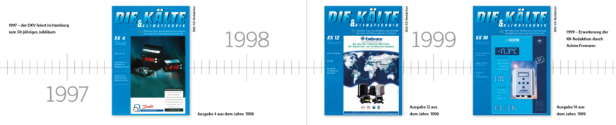 Und obwohl das Kälteanlagenbauerhandwerk seit den 90er-Jahren eine Hauptleserzielgruppe der KK darstellte, gab es gleichzeitig eine regelmäßige aktuelle Berichterstattung über das nationale und auch internationale Branchengeschehen, mit Reportagen über DKV-Tagungen, FKW-Seminare oder FGK-Infoveranstaltungen sowie über Messen wie die IKK, die ISH, die Mostra Convegno, die ASHRAE-Show oder die Interclima.