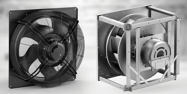 Die Axialventilatoren der AxiEco Baureihe von ebm-papst sind für Anwendungsfälle gedacht, wo hohe Volumenströme bei eher hohem Gegendruck benötigt werden, sodass luft- und klimatechnische Geräte von größeren Volumenströmen profitieren können. Die AxiEco Baureihe hat sich seit zwei Jahren am Markt etabliert und wird nun um die Baugrößen 630, 800 und 910 erweitert. Mit den höheren möglichen Volumenströmen von über 25.000 m³/h und Drücken von bis zu 700 Pa eignet sich der Axialventilator bspw. für Anwendungen in Chillern und Verdampfern, der industriellen Prozesskälte, in Rechenzentren sowie der mobilen Kältetechnik. Die RadiPac Baureihe arbeitet mit höheren Drehzahlen und Drücke, sodass sich auch Hochdruckanwendungen abdecken lassen. In den großen RadiPac Baugrößen findet der EC-Motor FanDrive DV 280 Anwendung. Dieser leistet ein Drehmoment bis zu 180 Nm bei Leistungen von bis zu 24 kW. Eingesetzt etwa im RadiPac der Baugröße 800, ermöglicht er freiblasend eine Luftleistung bis zu 50.000 m3/h und Maximaldrücke von 2300 Pa.