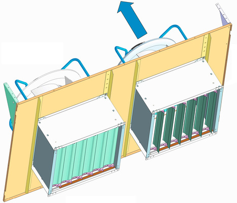 Die Fanwall bietet gegenüber Einzelventilatoren die Vorteile der kurzen Baulänge und einer optimalen Strömung. Anforderungen sensibler Anwendungsbereiche mit hoher Ausfallsicherheit kann die Fanwall ebenfalls erfüllen. Wichtig sind dabei die regelungstechnische Ansteuerung sowie die Unterbindung der Kurzschlussströmung, die entsteht, wenn ein Ventilator nicht in Betrieb ist. Die Fanwallklappe von Wolf erledigt diese Aufgabe zuverlässig ohne Hilfsenergie und mit nur wenig Druckverlust.