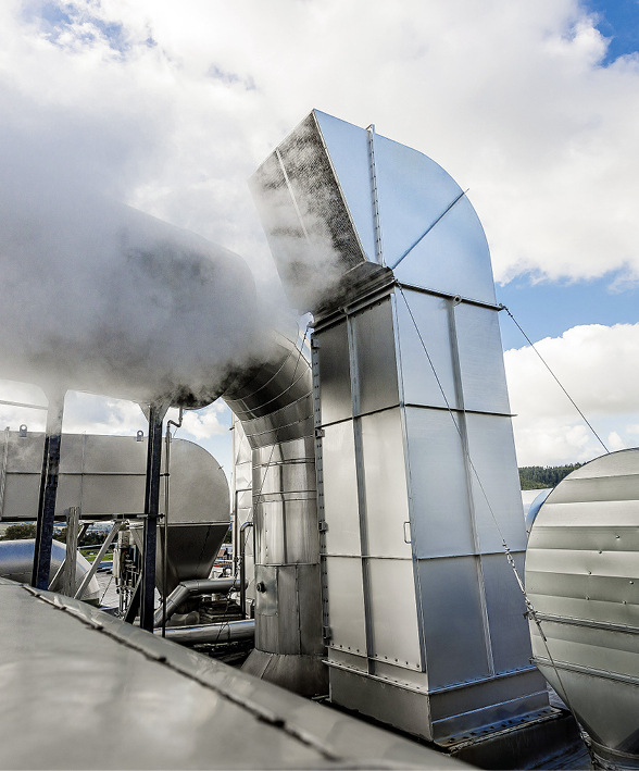 Feuchte, heiße und staubhaltige Luft ist auch in der Anlage zur Nebelabsaugung eine Herausforderung. Deshalb setzte man hier ebenfalls auf eine Ausführung in Edelstahl und zugängliche Kulissen für die Reinigung und Wartung. Die Anlage ist zudem mit einer abnehmbaren Regenhaube bzw. einem Rieselschutz ausgestattet.
