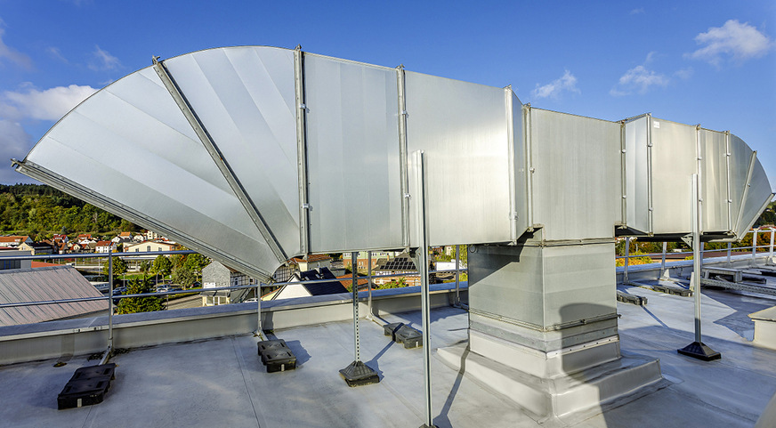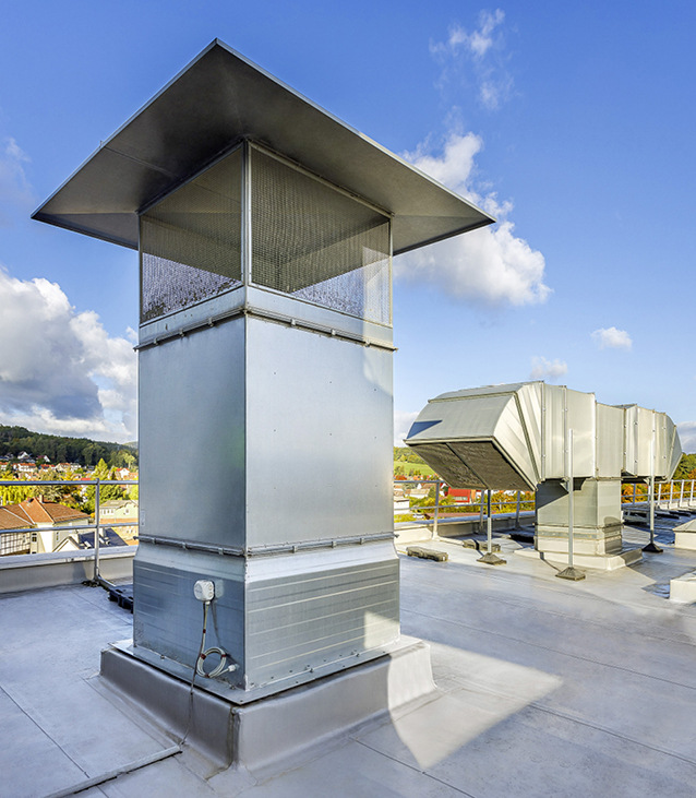 Die Neukonstruktion ist mit einem Aufnahmerahmen für den Axiallüfter ausgestattet, einem integriertem Kulissenschalldämpfer und einer angepassten Ansaughaube aus verzinktem Stahlblech. Hier war die Bauhöhe eine Herausforderung: Alles in allem durfte die Konstruktion nur maximal 2,20 m über die Attika kommen.