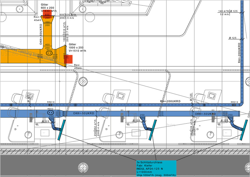 Die Einbringung der Zuluft in die Büro- und Beratungsräume des Kundencenters erfolgt über die Schlitzauslässe Indul von Kiefer. Diesen sind Volumenstrombegrenzer vorgelagert, die die Luftmengen der einzelnen Auslässe untereinander auf einen definierten Sollwert abgleichen. In diesem Fall beträgt der Volumenstrom jeweils 125 m3/h.