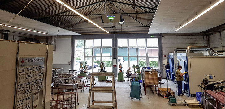 Dies bietet gerade Unternehmen, die große raumlufttechnischen Lösungen einsetzen, um die Luft zu reinigen, eine Möglichkeit, viel Energie einzusparen. In der Caritas-Werkstatt ist dieser Fall bislang noch nicht eingetreten: Grenzüberschreitungen hat es bisher während des Fertigungsprozesses noch nicht gegeben. Lediglich wenn die Absauganlagen in den Pausen ausgeschaltet werden, springt der Sensor auf Gelb oder wenn zum Feierabend die Werkstatt gereinigt wird, auch mal auf Rot.