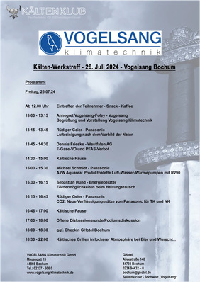 Auf den Kälten-Werkstreff am 26. Juli. Diesmal sind wir bei Vogelsang Klimatechnik in Bochum. Zur Begrüßung ab 12:00 Uhr gibt es einen Kaffee und Snack, bevor es mit den Vorträgen losgeht. Sie bekommen eine Menge Infos, unter anderem zu den neuen R 290-Wärmepumpen und Verflüssigungssätzen von...