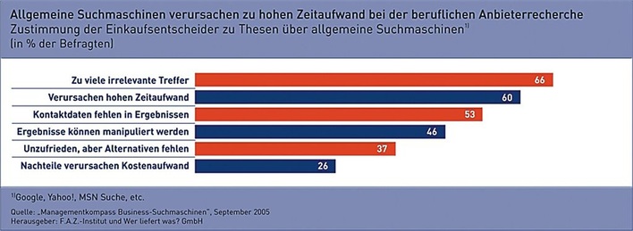 Ein neuer Firmenwagen ist längst fällig, der Lieferant für Arbeitsmaterialien soll gewechselt werden und für den Maschinen-Park muss ein neuer Service-Dienstleister her: Nahezu täglich werden neue Anbieter von Produkten und Dienstleistungen gesucht. Eine rasche und funktionelle Einkaufsrecherche verspricht das Internet, das als wichtigstes Recherche-Tool mittlerweile alle Kataloge, Verzeichnisse, Gelben Seiten oder Lieferanten CD-ROMs abgelöst hat. Doch Effektivität ist dabei besonders wichtig, denn Zeit ist bekanntlich kostbar.