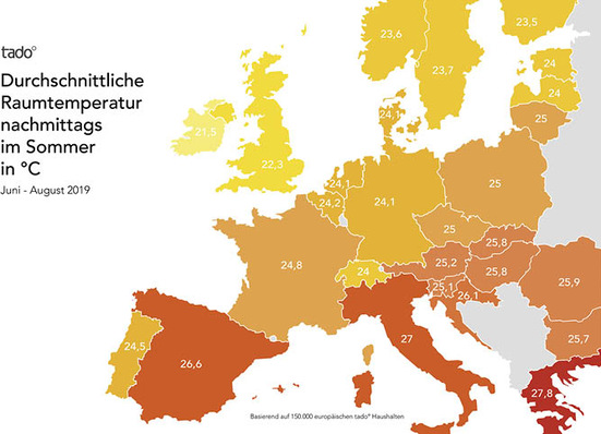 Nach einer Studie von tado sind die Raumtemperaturen der meisten Haushalte in Europa im Sommer zu hoch. Die Studie wurde in 150 000 europäischen Haushalten, im Zeitraum von Juni bis August 2019, zwischen 12 und 18 Uhr durchgeführt. In Deutschland lag die durchschnittliche Innentemperatur bei 24,1 ºC...