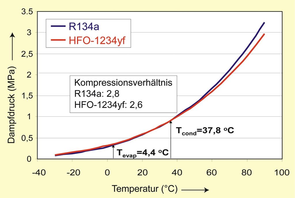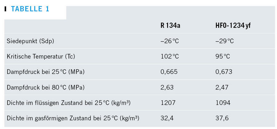 Da das Kältemittel ähnliche thermodynamische Eigenschaften wie R 134a besitzt, ist es kompatibel zur herkömmlichen Klimaanlagentechnik (Bild 3 und Tabelle 1). Die Umrüstung von R 134 a auf HFO-1234 yf erfordertdemnach keine aufwendigen und kostenintensiven Veränderungen an der derzeit aktuellen Technologie. Experten halten deshalb auch den zunehmenden Einsatz von HFO-1234yf als Retrofit-Kältemittel in bestehenden Kfz-Klimaanlagen für möglich.