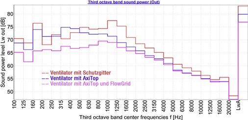 Die meisten breitbandigen Geräuschkomponenten dagegen werden durch die unvermeidbare Turbulenz der Zuströmung und die prinzipbedingte Strömung um die Schaufeln verursacht. Die breitbandigen Anteile bestimmen das Grundniveau des Geräuschspektrums eines Ventilators. Hier hat die Herstellerindustrie bereits einiges bewirkt und es ist eine Vielzahl von Möglichkeiten zur Geräuschreduktion bei Ventilatoren bekannt. Dazu gehören z. B. strömungstechnisch optimierte Lüfterräder, Winglets, Diffusoren und Vorleitgitter, mit denen Schallleistung und Schallpegel der Ventilatoren deutlich sinken. Bild 1 zeigt ein Beispiel für die beachtliche Geräuschreduktion, die sich durch den Einsatz des Vorleitgitters FlowGrid und des Diffusors AxiTop erreichen lässt.