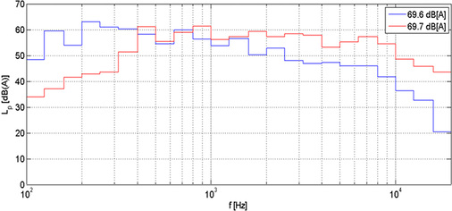 Sinkt der Schallpegel um einige Dezibel, bedeutet das, der Ventilator arbeitet deutlich leiser. Ob wir das verbleibende Geräusch als angenehm oder lästig empfinden, darüber sagt der physikalisch im Teststand gemessene Schallpegel aber nichts aus. Trompetenspiel beispielsweise und der Bagger auf einer Baustelle haben nämlich ungefähr die gleiche Schallleistung, werden aber psychoakustisch völlig unterschiedlich bewertet. Bild 2 zeigt ein weiteres Beispiel: In diesem Fall sind die Spektren zwar zu unterscheiden (es sind ja gerade die beiden Kurven), aber der Gesamtpegel ist (nahezu) gleich: 69,7 dB(A). Entscheidend ist hier, dass aufgrund des Spektrums keine Aussage über die Lästigkeit/Angenehmheit des Geräuschs gemacht werden kann, eventuell würde man aufgrund der tieffrequenten Anteile das blaue Spektrum (Musik!) als störender vermuten. Das menschliche Gehör ordnet die Geräusche aber völlig anders ein.