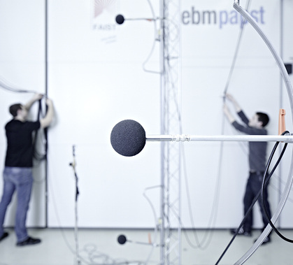 ebm-papst hat deshalb mit dem AudiMax“ (Bild 3) ein sogenanntes Psychoakustiklabor eingerichtet. Dieser schallisolierte Raum bietet Platz für bis zu acht Testhörer, denen die Geräusche der Ventilatoren in unterschiedlichen Konfigurationen vorgespielt werden. Mitarbeiter befragen die Probanden anschließend und schaffen so eine Datenbasis unter wissenschaftlichen Gesichtspunkten. Grundlage dafür sind die psychoakustischen Parameter Lautheit (Einheit sone), Schärfe (Einheit acum), Tonheit (Einheit mel), Rauigkeit (Einheit asper) und Schwankungsstärke (Einheit vacil). Daneben sind Tonhaltigkeit und Impulshaltigkeit bedeutsame Größen. Sie lassen sich mit Mikrofonen (Bild 4) messen und mit den Aussagen der Testpersonen vergleichen.