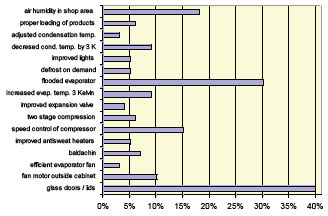 Allerdings wird in seiner Untersuchung auch deutlich, dass das Zusammenwirken zahlreicher Parameter entscheidend für den Energieverbrauch in Supermärkten ist (siehe Bild 2). Als wichtigste Maßnahme sticht dabei die Abdeckung der Kühlmöbel durch Glastüren bzw. Klappen hervor und liefert gleichzeitig Anlass zur Diskussion: Denn bei ungeeigneter Beleuchtung kann es genau durch diese Abdeckung zur Wärmeentwicklung kommen, die wiederum den Einsatz einer Klimaanlage erfordert: ein gutes Beispiel dafür, dass man nie nur einen Parameter losgelöst von allen anderen betrachten sollte. Das gilt im Übrigen auch für die Kältemittel. So sollte bei aller Euphorie um natürliche Alternativen immer die Energieeffizienz im Auge behalten werden.