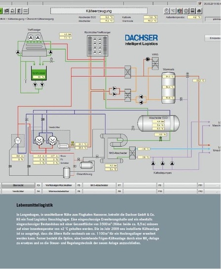 Am Dachser-Standort Langenhagen sollte nun für einen Erweiterungsbau (2400 m²) und ein bestehendes Lebensmittel-Umschlaglager (1100 m²) eine neue Kälteanlage zur Hallenkühlung installiert werden. Die Anlage wurde von der Enprovis GmbH, Kempten im Allgäu, für Dachser geplant und von der Zimmermann Industriekälte aus Seevetal (südlich von Hamburg) gebaut. Die Zimmermann GmbH ist ein in der zweiten Generation geführtes Familienunternehmen, zu dessen Kunden zahlreiche Unternehmen der Lebensmittelindustrie und Lebensmittellogistik sowie der chemischen Industrie zählen.