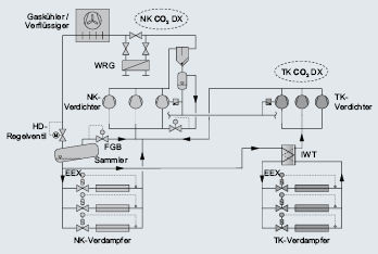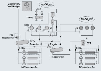 Kaskadensysteme sind charakterisiert durch unabhängige Kältemittel- und Ölkreisläufe und einen Austausch der Wärmeenergie über einen oder mehrere Kaskadenwärmetauscher. Das diskutierte System arbeitet jeweils mit einstufiger Verdichtung für die NK- und TK-Stufe. Typischerweise wird die NK-Stufe mit einem zweistufigen Expansionsprozess mit Sammler und FGB-Ventil für Druckreduzierung ausgeführt, während die TK-Stufe nur mit einstufiger Expansion betrieben wird. Flüssiges CO 2 aus dem Sammler versorgt die Kaskadenwärmetauscher auf der Verdampferseite.