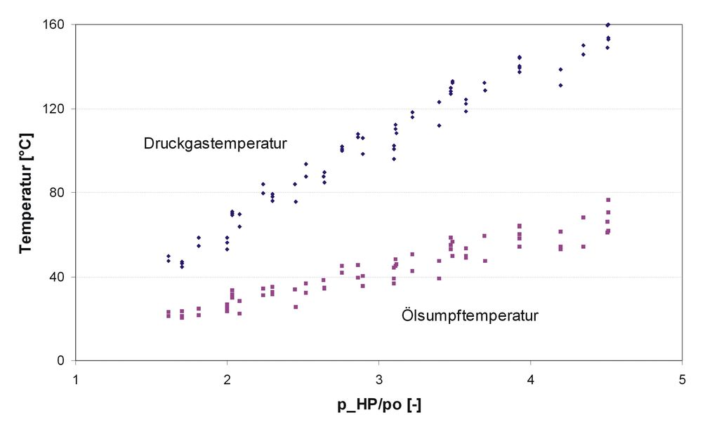 Die minimale Druckgastemperatur ist besonders im Zusammenhang mit dem Kurbelgehäusedruck und der Ölsumpftemperatur interessant. Neben dem Massenstrom, der den internen Kühlungseffekt beeinflusst, zeigt die Druckgastemperatur den stärksten Einfluss auf die Ölsumpftemperatur. Die resultierende Druckgastemperatur ist abhängig von elektrischen, mechanischen und internen Druckverlusten plus der Wärmeabgabe an die Umgebung. Bild 4 zeigt das Verhältnis zwischen Druckgas- und Ölsumpftemperaturen über dem Druckverhältnis. Die Messungen wurden für die Verdichtertypen 4FTC, 4HTC, 4JTC, 4KTC und 4MTC durchgeführt. Eine Saugüberhitzung von jeweils 10K, Verdichtungsenddrücke von 40, 62, 84, 106bar und Verdampfungstemperaturen von 5 bis 20°C in Temperaturschritten von 5K wurden für die Messungen berücksichtigt. Die Umgebungstemperatur um den Verdichter entsprach 32°C.