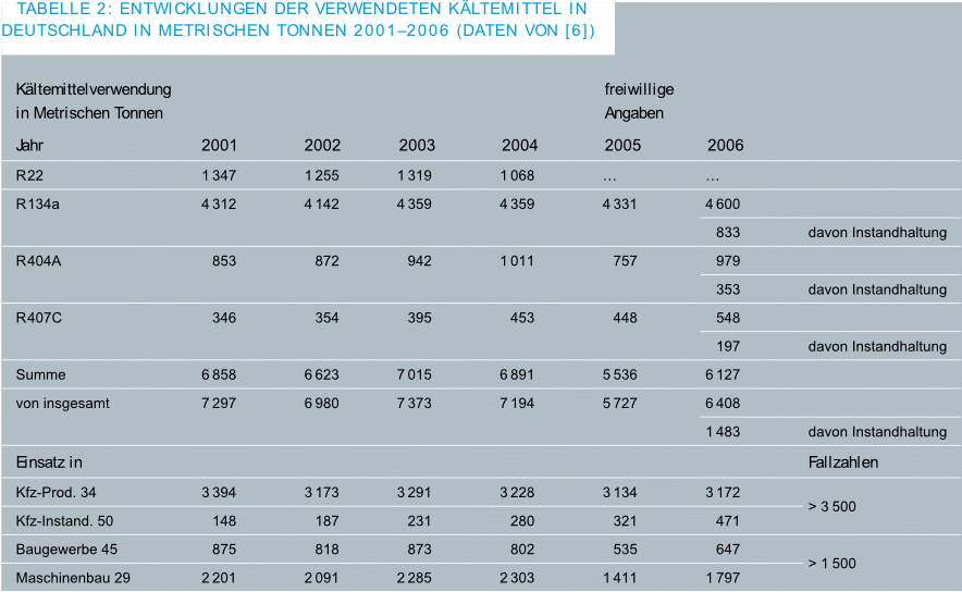 Die im Jahre 2006 eingesetzten 6408 Tonnen Kältemittel in der Kälte-Klima- und Wärmepumpentechnik sind 74% der insgesamt verwendeten klimawirksamen Stoffe. Von diesen 6408 Tonnen finden 57% Einsatz in der Kfz-Herstellung und Wartung (Wirtschaftszweig WZ 34 und 50). Hierzu haben mehr als 3500 Unternehmen (Fallzahlen) ihre Daten an die Statistischen Landesämter übermittelt.