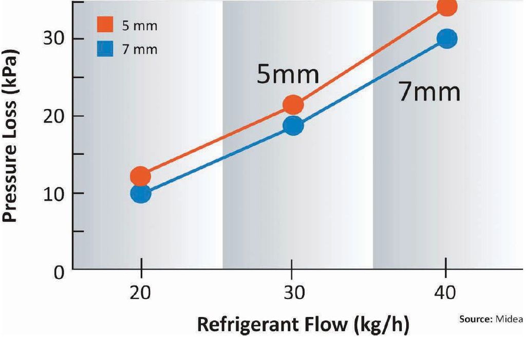 Der kleinere Querschnitt eines MicroGroove-Rohres hat Einfluss auf die Durchflussrate und den Druckabfall in einzelnen Rohren, siehe Bild 3. Bei einem Rohr mit kleinerem Durchmesser ist der Druckabfall bei einer bestimmten Durchflussrate des Kältemittels höher.