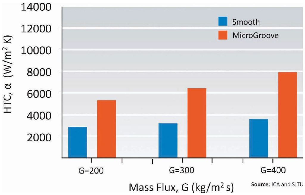 Darüber hinaus zeigen die Experimente, dass lokale Wärmeübergangskoeffizientensogar bei Rohrdurchmessern von 4 mm oder weniger durch Innenrippen oder microfin-Strukturen weiter verbessert werden können. Bild 2 zeigt, wie sich der lokale Wärmeübergangskoeffizient in Rohren mit kleineren Durchmessern durch Innenrippen verbessert.