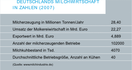 Viele Molkereien in Deutschland haben mit Sicherheit schon bessere Zeiten gesehen, was die häufig mangelnde Investitionsfreudigkeit erklärt. So macht die EU-Milchquote, d.h. die individuelle Produktionshöchstgrenze des einzelnen Landwirts, die vom EU-Ministerrat festgesetzt und vom deutschen Zoll überwacht wird, den meisten zu schaffen. Das wird in Zukunft nicht besser. Ganz im Gegenteil: Laut Brüsseler Agrarreform soll die Milchquote bis 2015 komplett abgeschafft werden. Bis dahin ist eine kontinuierliche Erhöhung der Milchmengen bzw. eine Senkung der Quote geplant. Damit wird der Milchmarkt endgültig liberalisiert, was aber auch heißt, dass der Preisdruck mit steigendem Angebot aller Voraussicht nach zunehmen wird.