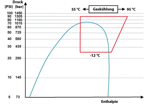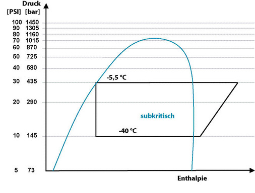 Der klassische Kältekreislauf wie wir ihn alle kennen ist subkritisch (unterkritisch), d.h., sämtliche Temperatur- und Druckbereiche liegen unterhalb des kritischen Punkts und oberhalb des Tripelpunkts. Ein einstufiges subkritisches CO 2 -System ist einfach, hat aber aufgrund seines eingeschränkten Temperaturbereichs und des hohen Drucks auch einige Nachteile. Der Betriebsdruck für subkritische Systeme liegt normalerweise im Bereich von 5,7 bis 35 bar, entsprechend 55 bis 0 °C