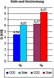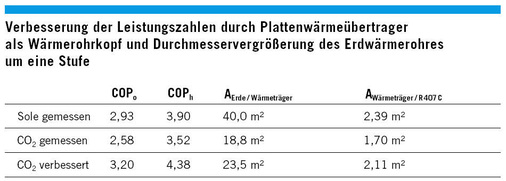 Die zu geringen Kälte- und Wärmeleistungen wurden durch die geringeren Flächen des CO 2 /R 407 C-Plattenwärmeübertragers mit 1,67 m 2 , in der Fläche nahezu gleich dem früheren Shell und Coil-Wärmeübertrager mit 1,7 m 2 und dem kleinerem Erdwärmerohr mit nur 39 mm lichter Weite und einer Oberflächengröße von nur 18,8 m 2 mit einem angepassten Kompressor mit 5,92 m 3 /h Fördervolumen verursacht.