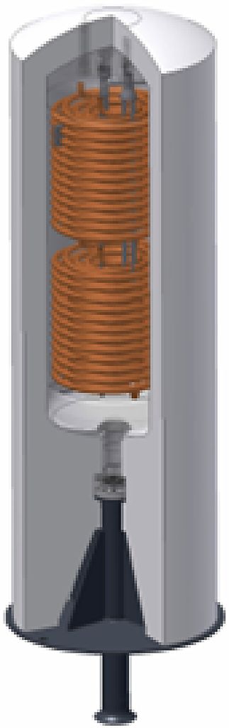 Der Shell and Coil-Wärmeübertrager besteht aus zwei parallel geschalteten Elementen in einem Druckbehälter aus je vier Kupferrohrwendeln. Der gesamte Wärmeübertrager mit einer Fläche von 1,7 m 2 wurde für ein 100 m langes Erdwärmerohr mit einer Wärmeentzugsleistung von 5 kW ausgelegt und um 25 Prozent überdimensioniert. Seine Leistung wurde auf einem 7 m langen Testwärmerohr mit einem darunterliegendem CO 2 -Dampferzeuger zur Simulation eines 5-kW-Erdwärmerohres von 100 m Tiefe mit R 134 a zu 6,48 kW und mit R 407 C zu 6,71 kW gemessen. Als Nennleistung wurde 6,5 kW für den Vergleich zur Solesonde definiert.
