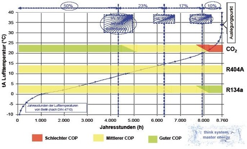 In Bild 4 ist die Summe der Jahresstunden der Lufttemperaturen in Berlin gezeigt (nach DIN 4710). Links neben der Jahresmitteltemperaturlinie (tA 9 °C) liegen 50 Prozent der Jahresstunden. Nur für zehn Prozent der Jahresstunden liegt die Temperatur über 20 °C, siehe ganz rechts im Diagramm. Das Kältemittel R 404 A dient als Basis des Energieeffizienzvergleichs, deshalb ist es über die gesamten Jahresstunden mit einem mittleren COP (gelber Balken) bewertet.