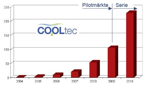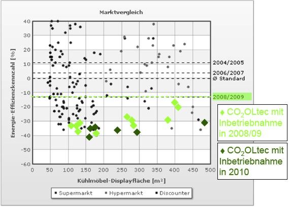 Ein Vergleich der Märkte mit Inbetriebnahme ab ca. Mitte 2009 zeigt deutliche Effizienzvorteile für das Kältemittel CO 2 . Die Energieeffizienzstandards bei den Kühlmöbeln sind vergleichbar, zum Beispiel kommen überall elektronische Expansionsventile zum Einsatz.
