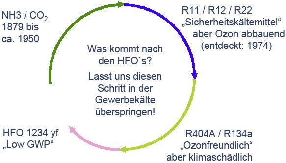Das Rad der Geschichte für Kältemittel scheint sich zu schließen (Bild 2). CO 2 eines der ersten Kältemittel wurde in der Schiffskälte bis circa 1950 eingesetzt. Seit mehr als zehn Jahren erfährt das Kältemittel CO 2 eine Renaissance insbesondere in der sogenannten Supermarktkälte!