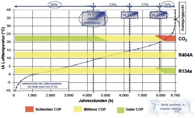 Für das Kältemittel CO 2 liegen die Verhältnisse genau umgekehrt. Bei hohen Au-ßentemperaturen im transkritischen Betrieb hat CO 2 einen schlechteren COP. Demgegenüber erreicht CO 2 mehr als die Hälfte des Jahres bei mittleren und kalten Außentemperaturen einen besseren COP. So können in der Supermarktkälte attraktive Energieeinsparpotenziale bei Jahresmitteltemperaturen bis zu 15 °C abgeschöpft werden!