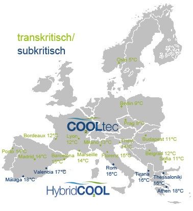 Bei Jahresmitteltemperaturen bis zu 15 °C können nachhaltige Energieeinsparungen erzielt werden. Diese Ergebnisse stehen im Einklang mit den wesentlichen Ergebnissen der EPEE Eco-Efficiency Study of Supermarket Refrigeration [7]. Zum Beispiel betragen die Jahresmitteltemperaturen in Stockholm 7 °C, in Berlin 9 °C, in Paris 12 °C, in Mailand 13 °C und in Madrid 14 °C, weitere Städte siehe Bild 7.