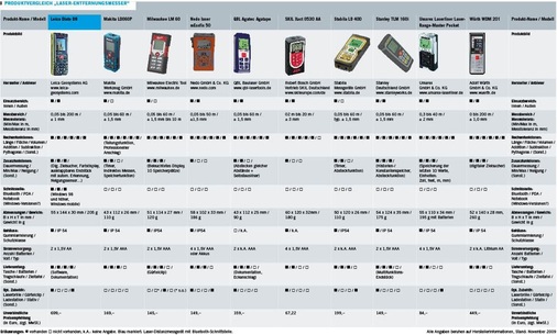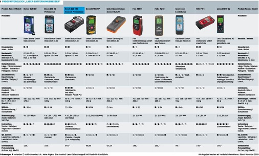Auf den Seiten 44 bis 47 wurden 20 aktuelle Geräte miteinander verglichen. Einige große Hersteller führen auch mehrere Modelle im Produktprogramm. In dieser Übersicht wird jedoch pro Anbieter nur ein Modell vorgestellt, mit Ausnahme der beiden Bluetooth-Modelle. Wichtige Auswahlkriterien für ein Laser-Messgerät sind eine Reihe von Merkmalen, die in diesem tabellarischen Produktvergleich berücksichtigt wurden.