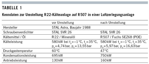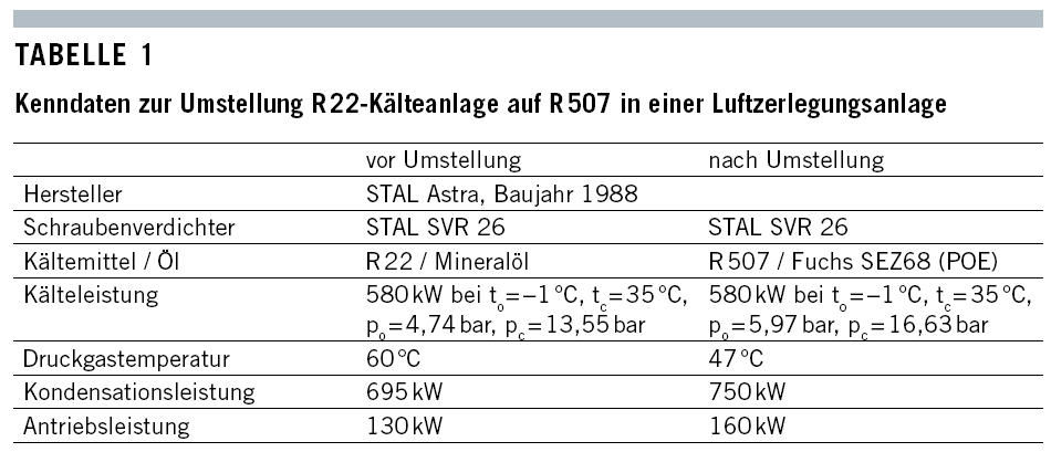 - einer Umstellung (Retrofit) auf R 507 mit überfluteter Verdampfung und offenem Schraubenverdichter aus der Luftvorkühlung einer Luftzerlegungsanlage,