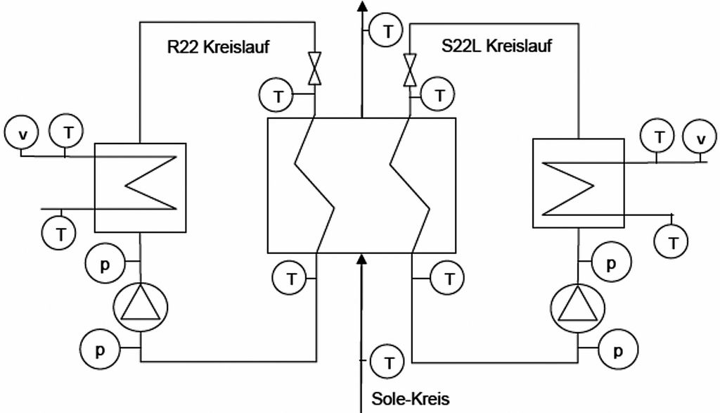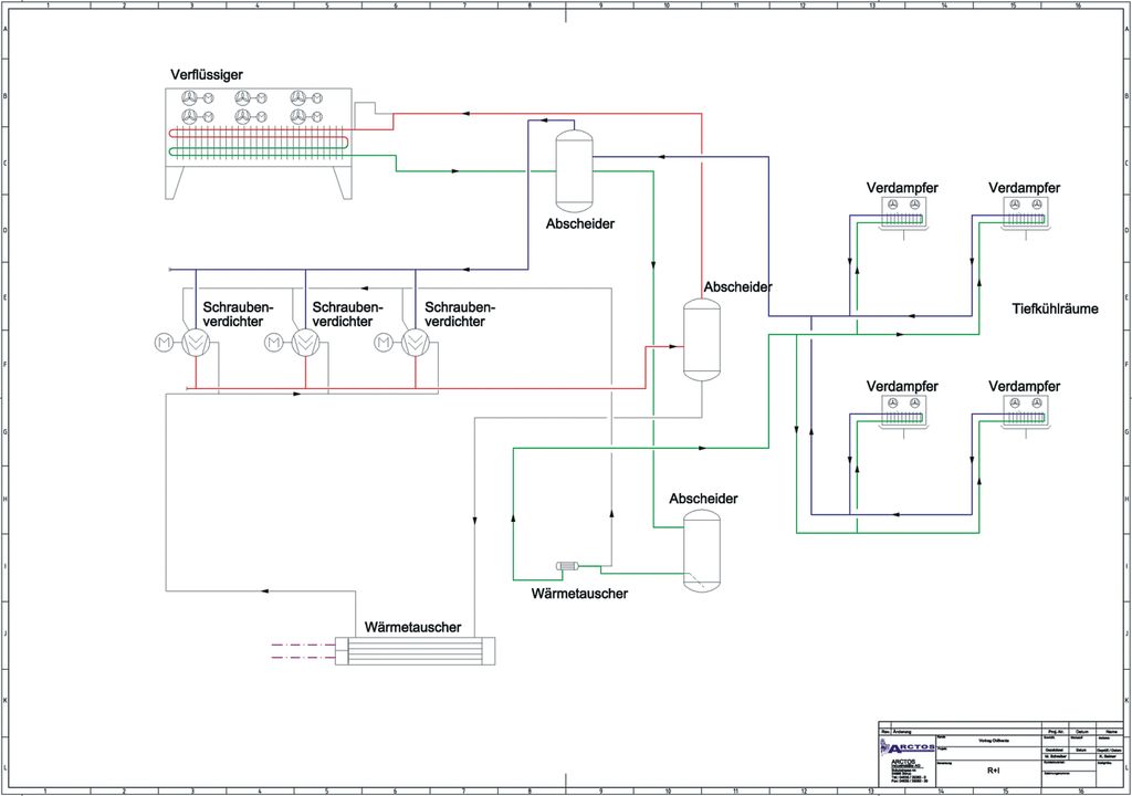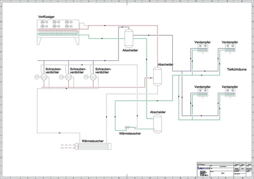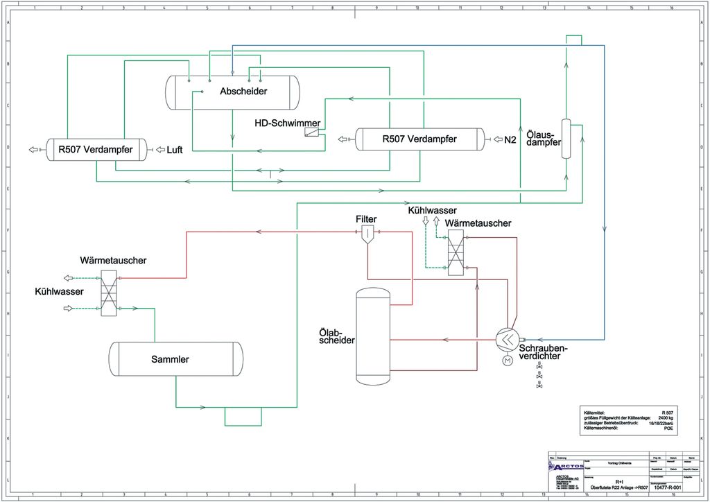 Die Kälteanlage wurde 2008 nach einer ca. zweijährigen Stillstandzeit als Ersatz für eine alte R 22-Kolbenverdichteranlage wieder in Betrieb genommen. Den gesetzlichen Vorgaben folgend, wurde im Rahmen der Wiederinbetriebnahme auch das bisher verwendete R 22/Mineralöl (Clavus G 68 ) auf R 507/Polyolesteröl (Fuchs SEZ68) umgestellt. Gründe, die zur Entscheidung führten, R 507 einzusetzen, waren ein begrenztes Budget, das einen kompletten Neubau nicht erlaubte, sowie vorhandene gebrauchte Komponenten (Verbundsatz, luftgekühlter Kondensator), die eine Integration mit den vorhandenen Anlagenteilen im Rahmen der R 507-Umrüstung anraten ließen. Das Anlagenschema ist in vereinfachter Form in Bild 2 wiedergegeben.