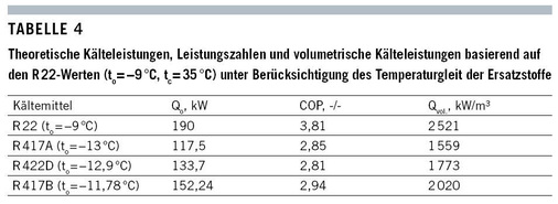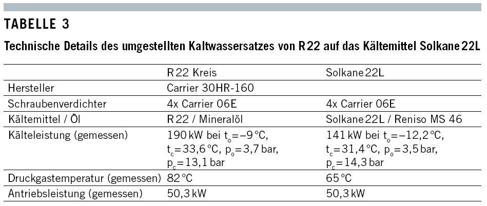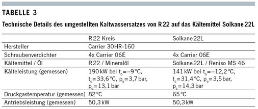 Entscheidungsfindung: Die Anlage ist Teil eines komplexen Produktionsprozesses zur Herstellung von R 22 als Rohstoff für die PTFE-Produktion. Die Betriebssicherheit der Kälteanlage hatte bei der Auswahl möglicher R 22-Alternativen die höchste Priorität. Durch die negativen Erfahrungen bei der Umstellung semihermetischer Kompressoren von R 22/Mineralöl auf R 507/POE-Öl (siehe vorheriges Beispiel), wurde eine Umrüstung des Kältemittels unter Beibehaltung des Kältemaschinenöltyps beschlossen. Da der Kaltwassersatz mit Leistungsreserven ausgestattet ist, konnte ein zu erwartender Leistungsverlust (siehe Tabelle 4) in Kauf genommen werden. Auf Basis der theoretischen Vorausberechnung wurde die Anlage von R 22 auf das Kältemittel Solkane 22L (R 417B) umgestellt.