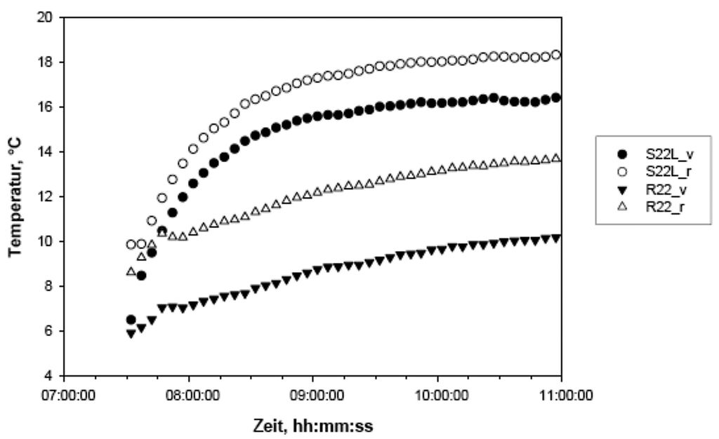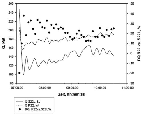 Ergebnisse Stand 08/2010: An der Anlage wurden an verschiedenen Tagen, zu gleichen Zeiten, unter identischen Last- und Umgebungsbedingungen vergleichende Messungen durchgeführt. In Bild 5 ist der Temperaturverlauf der Kaltsole im Vor- und Rücklauf über die Zeit abgebildet, jeweils für den Betrieb des einzelnen R 22- und des Solkane 22L-Kreises. Beide Temperaturverläufe steigen an. Der Grund dafür ist, dass mit Messbeginn von dem zweikreisigen Betrieb auf den jeweiligen einkreisigen Betrieb umgestellt wurde. Mit Erreichen der für den Produktionsprozess kritischen Temperatur wurde der einkreisige Solkane 22L-Betrieb beendet und der zweite Kreis (R 22-Kreis) zugeschaltet. Anschließend wurde am nächsten Tag für ein identisches Zeitintervall die Messung unter gleichen Bedingungen für den einkreisigen R 22-Betrieb wiederholt. Auch hier steigt die Temperatur an, jedoch weniger stark als beim reinen Solkane 22L-Betrieb. Die gemessenen Leistungen während des Solkane 22L-Betriebes sind im Schnitt 25 % geringer gegenüber dem reinen R 22-Betrieb (siehe Bild 6). Dieser Wert liegt innerhalb der zuvor theoretisch prognostizierten Werte (vgl. Tabelle 4).