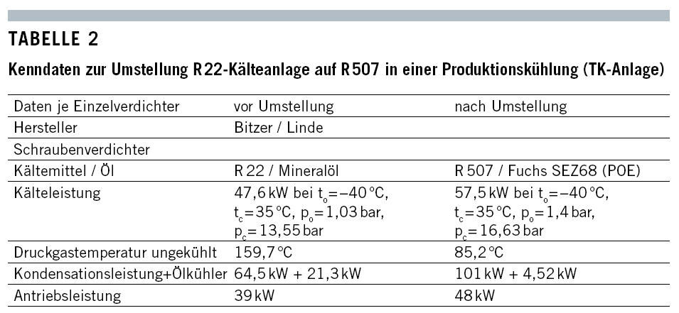 Die vorgestellte Verbundanlage mit semihermetischen Verdichtern (Beispiel 2) und Direktverdampfung erreichte die prognostizierten Leistungswerte. Jedoch führte vermutlich die Umstellung auf das R 507/POE-Öl-System zu Wicklungskurzschlüssen, so dass die Kompressoren kurze Zeit später nach der Umstellung ausgetauscht werden mussten. Nach Austausch der Verdichter läuft die Anlage zuverlässig im Dauerbetrieb. Aus wirtschaftlichen Gesichtspunkten, aber auch aus Gründen einer geforderten Zuverlässigkeit der Anlage, war die Umrüstung weniger erfolgreich.