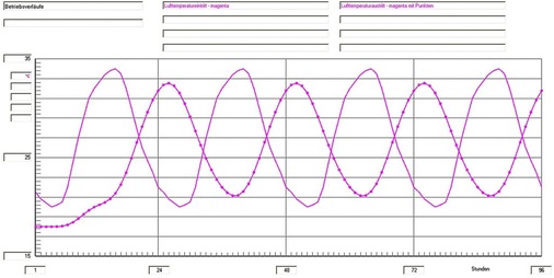 Die durchgehende magentafarbene Linie zeigt die Außenlufttemperatur, die magentafarbene Strich-Punkt-Linie zeigt die Austrittstemperatur aus dem Speicher ohne Regeneration. Während der jeweiligen Betriebsstunde wurde die Außentemperatur und die Austrittstemperatur als konstant angenommen. Somit wurde aus dem reell vorliegenden instationären Problem der Wärmemechanismen eine stationär bestimmbare Fallstudie.
