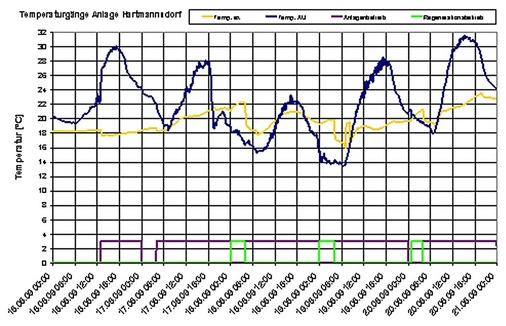 Daraus ist ersichtlich, welches Speichervolumen am effektivsten für eine aktive Luftkühlung in der benötigten Betriebszeit sorgt. Weiterhin wurde die Soll-Zulufttemperatur dargestellt. Die Fläche zwischen Außentemperatur und Austrittstemperatur stellt die erreichte Kälteenergiemenge dar. Sie ist am größten, wenn das Minimum der Austrittstemperatur und das Maximum der Tagestemperatur zur gleichen Zeit erfolgen. Die Phasenverschiebung entspricht dann 12 Stunden. Dabei stellt sich die maximale Leistung des Speichers ein.